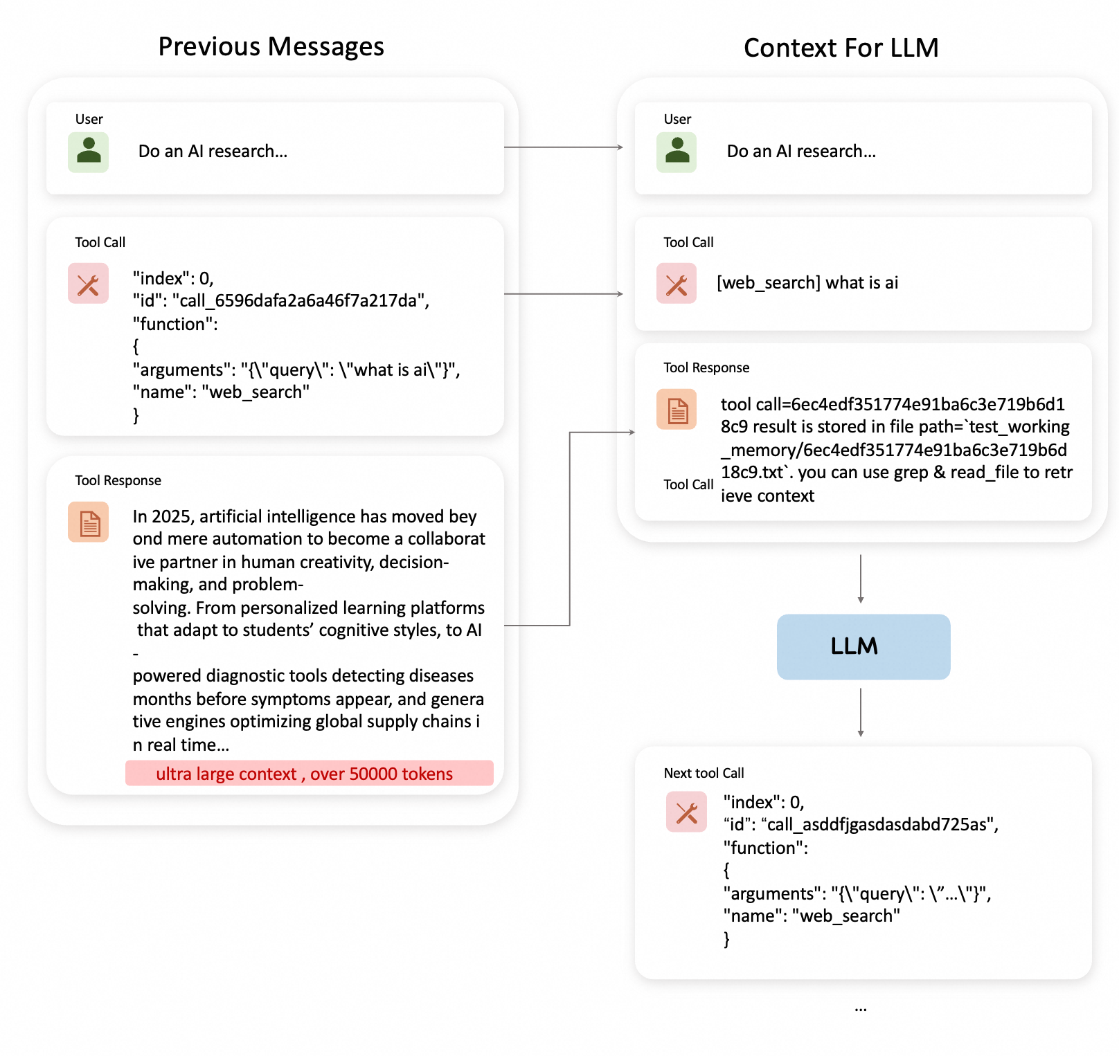 In modern AI agent systems, LLMs interact with tools through iterative loops, accumulating conversation history and tool results. With each iteration, a critical problem emerges: